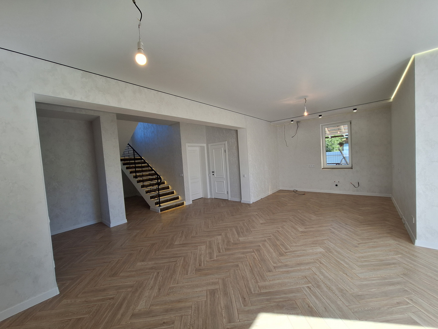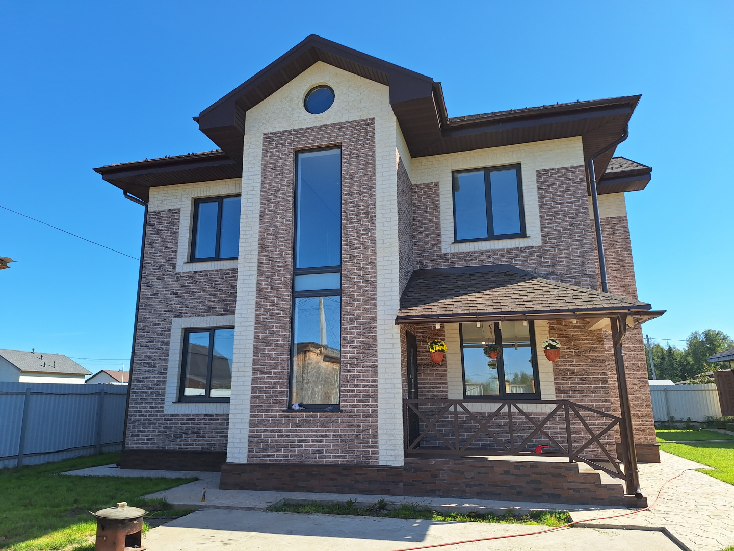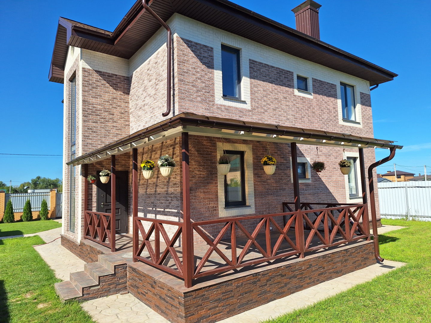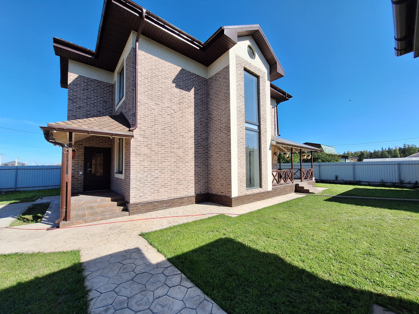 Дом построен из качественных материалов под ключ (без мебели) с отделкой и сантехникой, лестница - железо-бетон, конвекторы, розетки, выключатели, на полу ламинат и плитка.