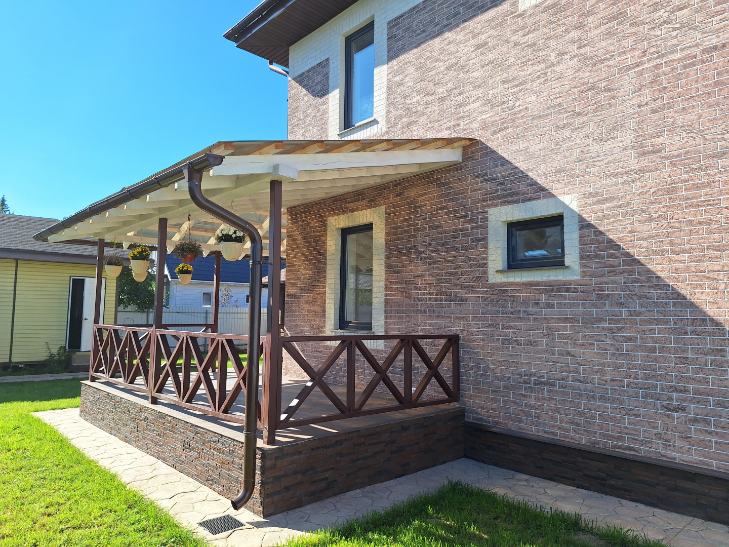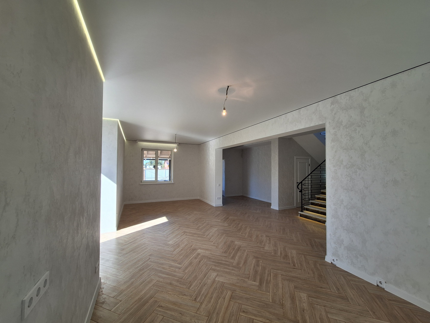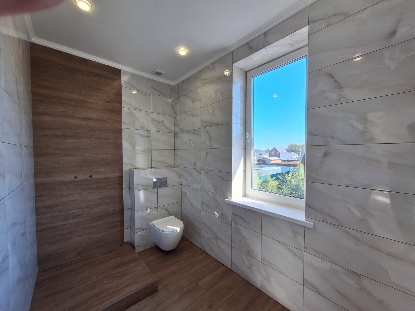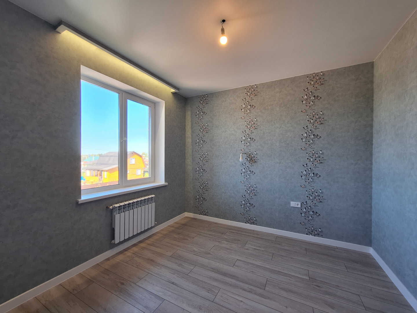 Дом построен из качественных материалов под ключ (без мебели) с отделкой и сантехникой, лестница - железо-бетон, конвекторы, розетки, выключатели, на полу ламинат и плитка.