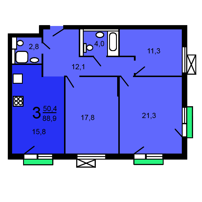 Общая площадь квартиры 82,7 м. кв. комнаты изолированы 11/21/17,8 м.кв., большая кухня 15,8 м.кв., два санузла.