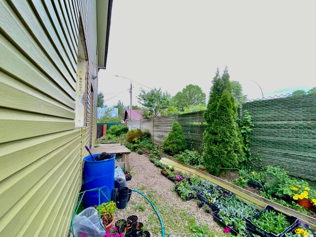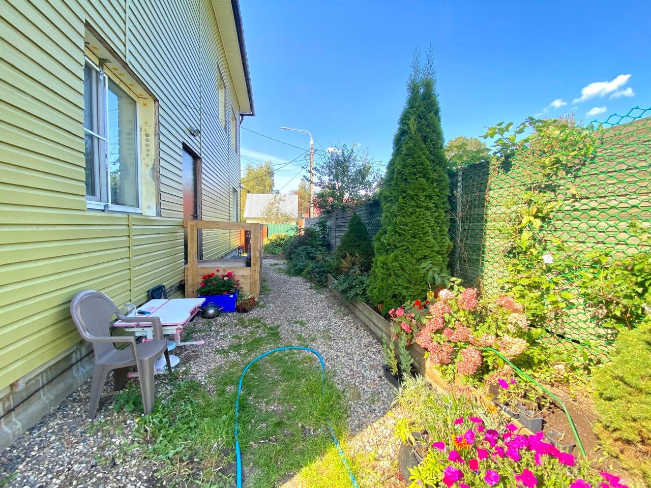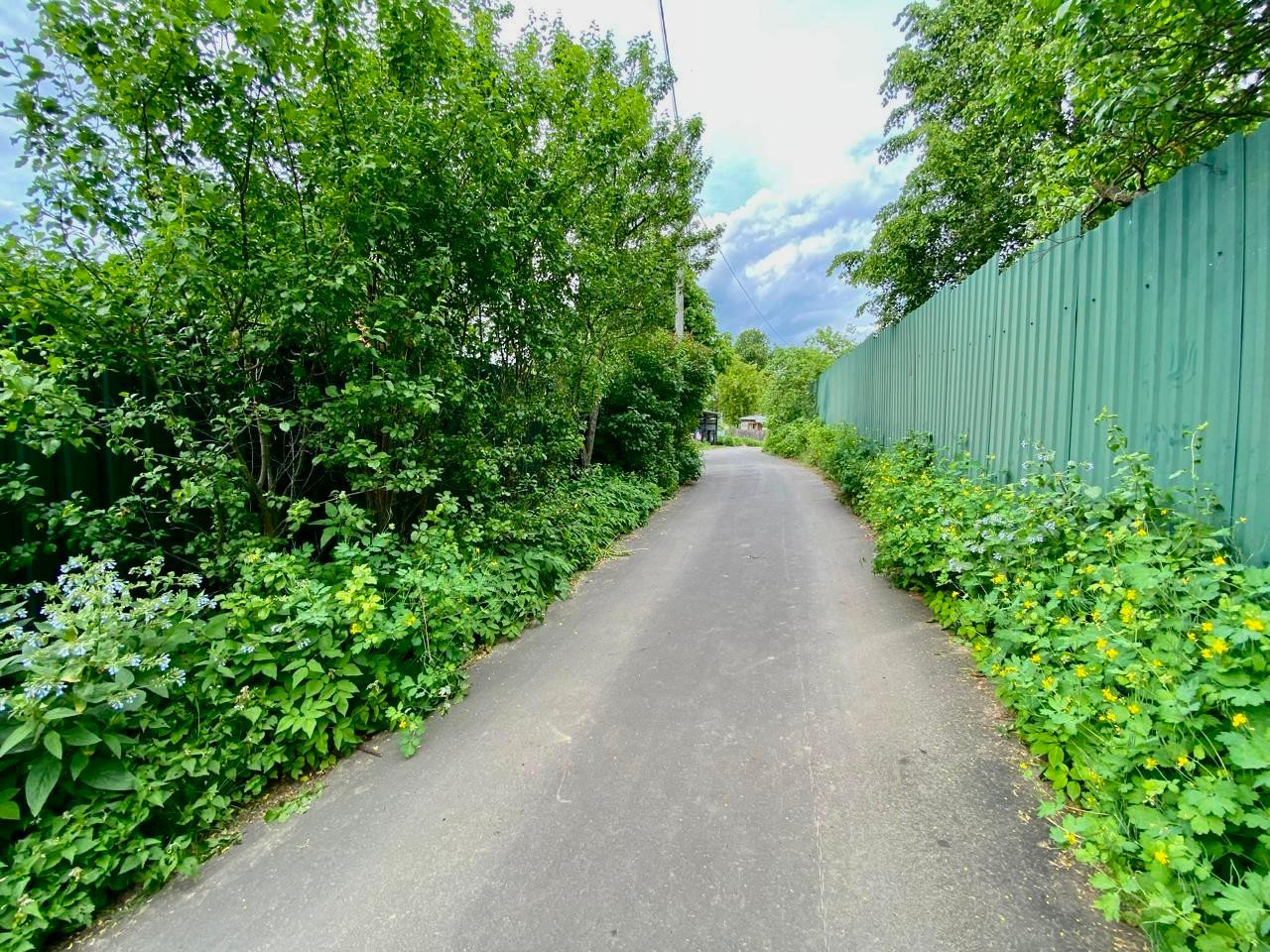 Участок ровный, правильной формы, находится в тупике, к дому ведет асфальтированная дорога, высажено много цветов и кустарников.