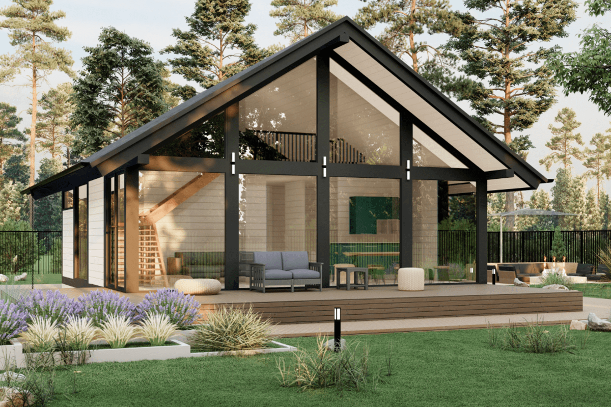 Готовые коттеджи в едином скандинавском стиле прекрасно вписываются в лесную зону.