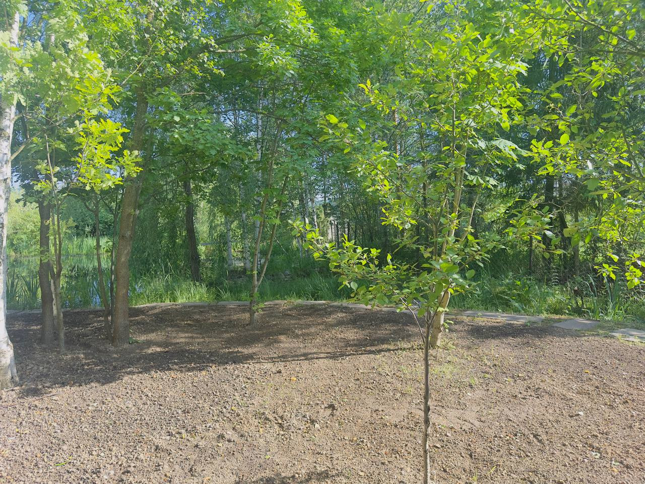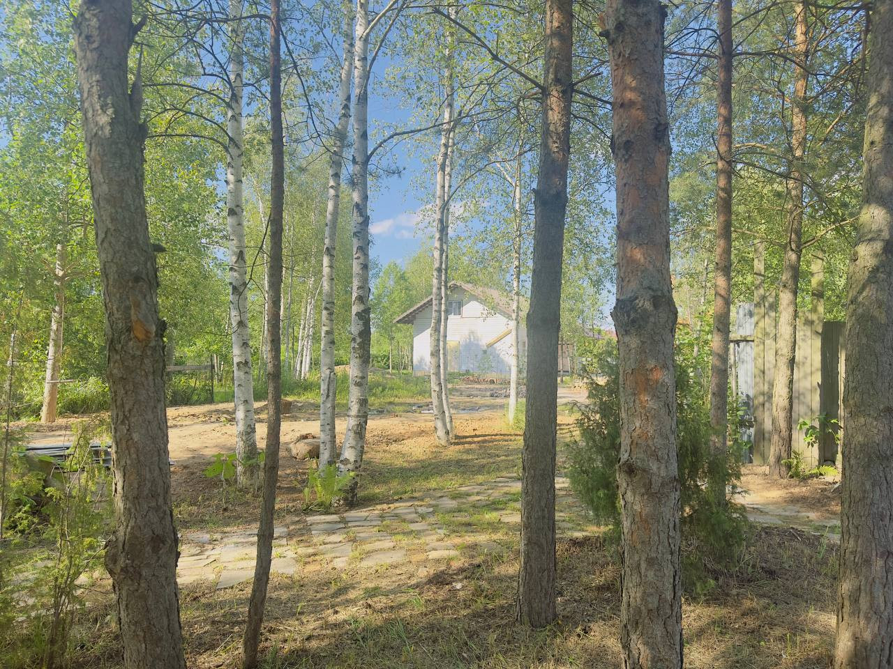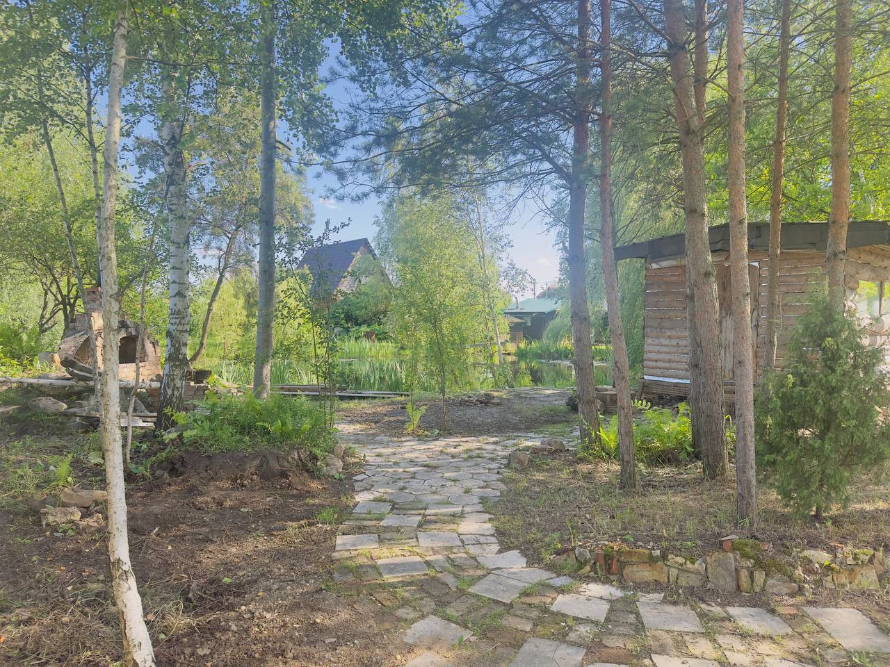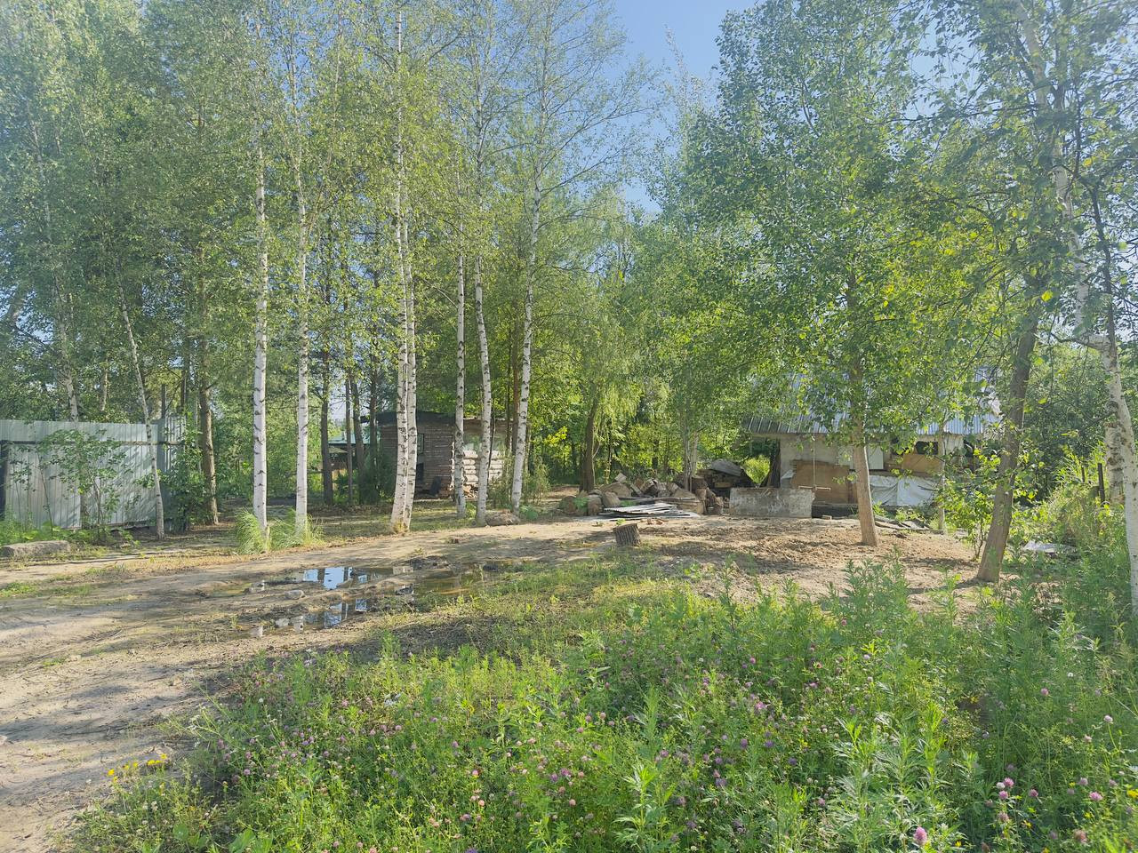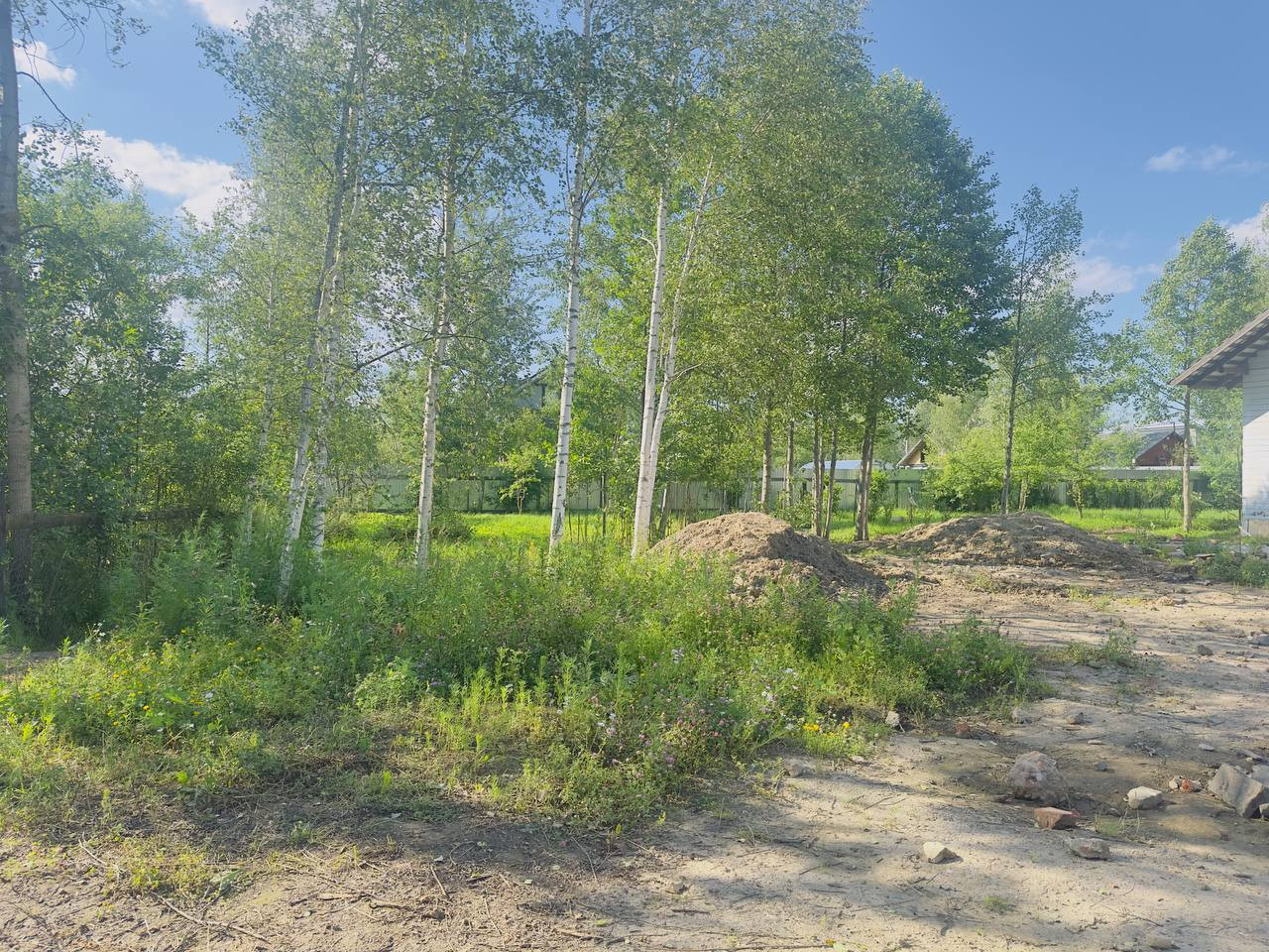 Участок огорожен. На участке есть небольшое озеро, создающее атмосферу уюта и спокойствия. Также на территории имеется хозяйственный блок, который можно использовать для хранения инструментов и материалов и бунгало (бытовка), в котором можно переночевать или использовать как временное жильё для строителей.